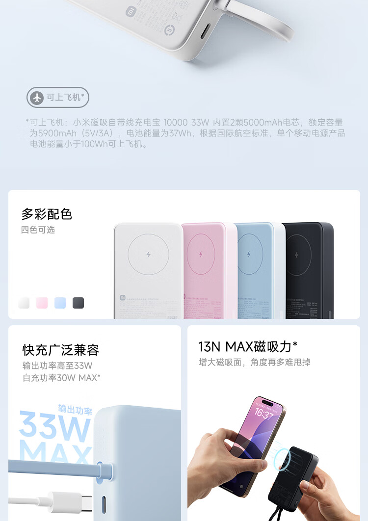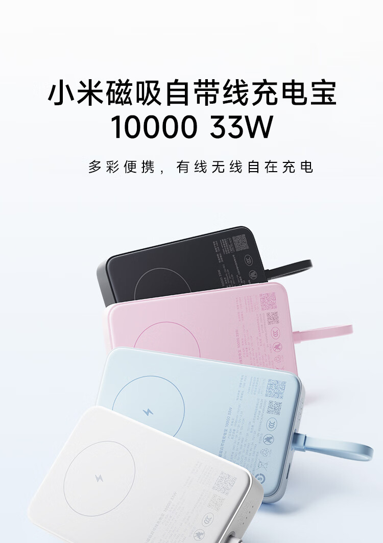 小米(MI)【3C认证】小米磁吸自带线充电宝 10000 33W 蓝色有线无线自在充电 iPhone安卓可用可上飞机/火车