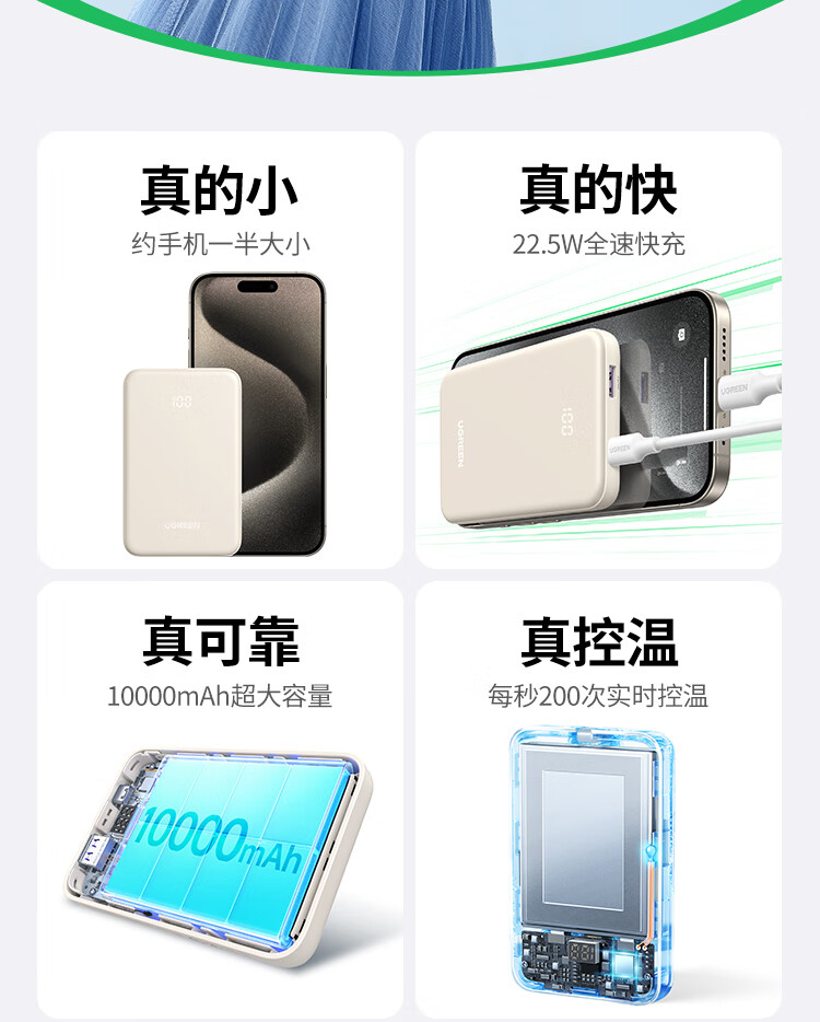 绿联【3C认证可上飞机】充电宝10000毫安22.5W快充大容量小巧迷你便携移动电源适用苹果16/小米/华为