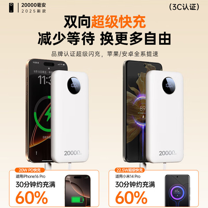 绿联【3C认证可上飞机】充电宝20000毫安22.5W快充 大容量迷你小巧便携移动电源适用苹果16Pro小米华为