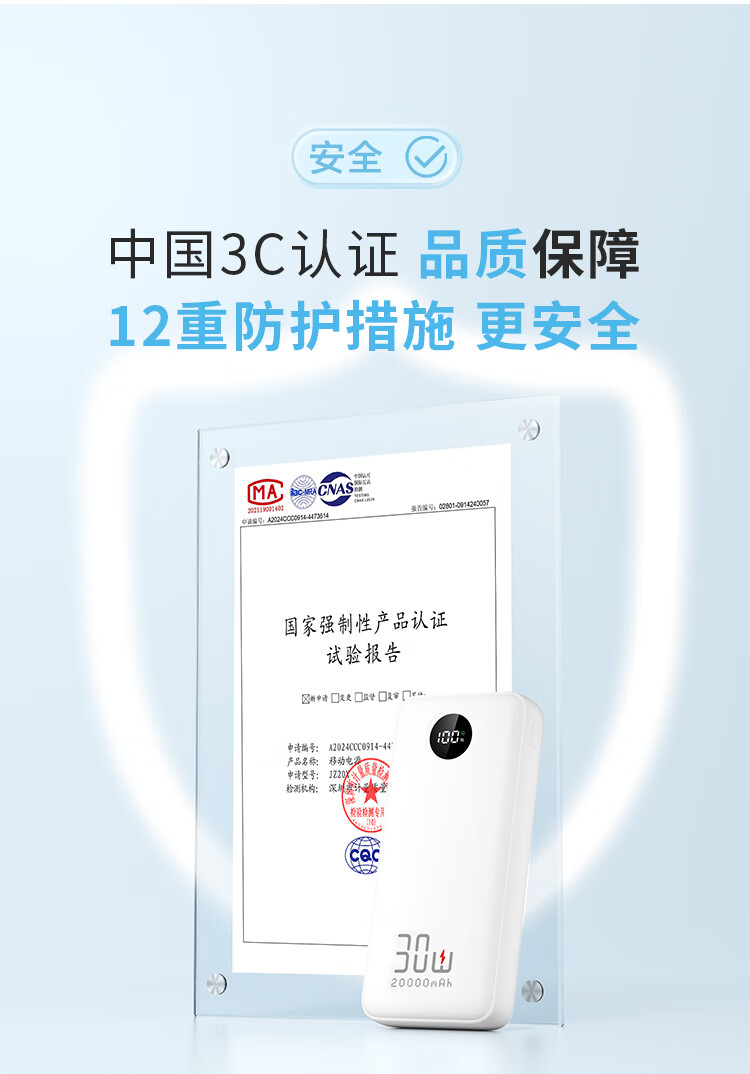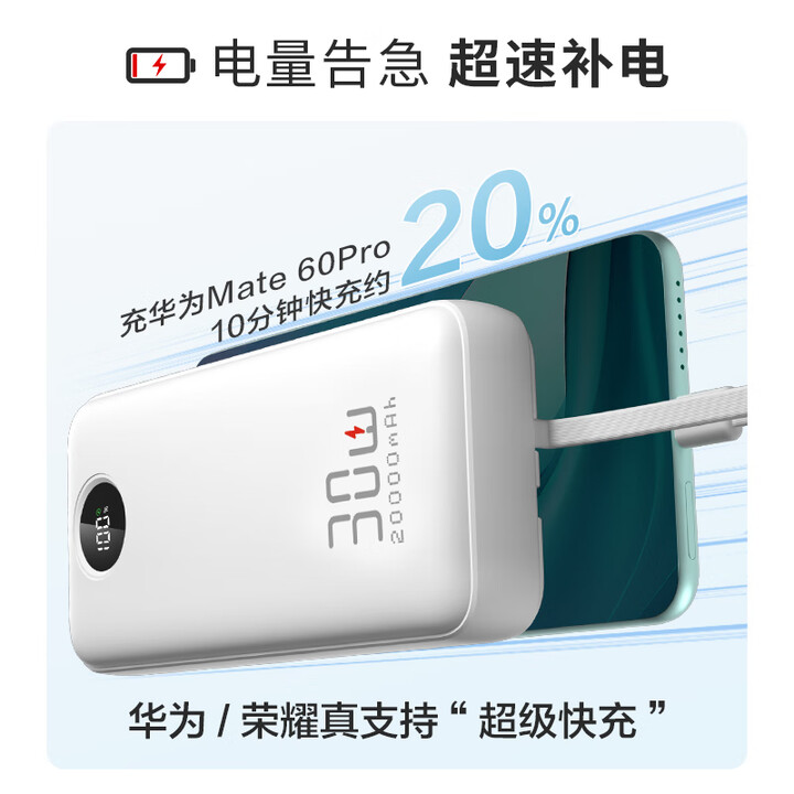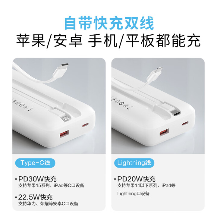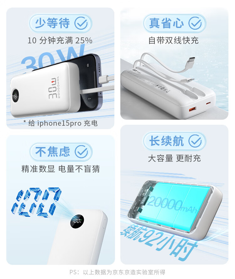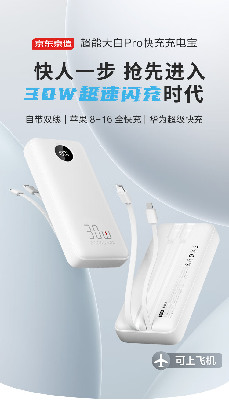 京东京造充电宝3c认证可上飞机30W自带线20000毫安大容量京东自营快充移动电源