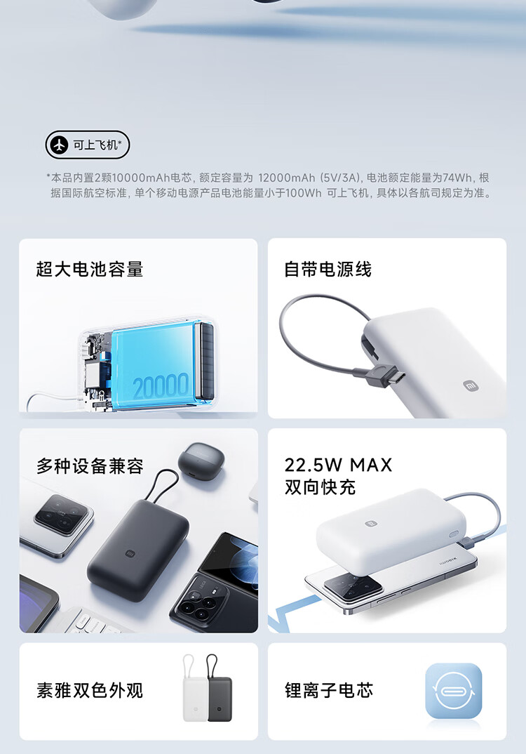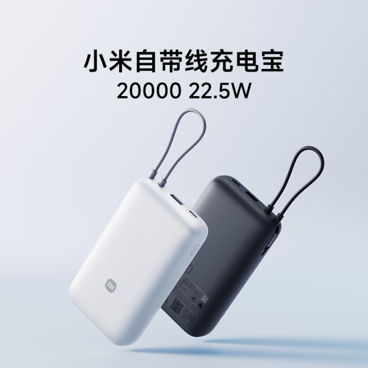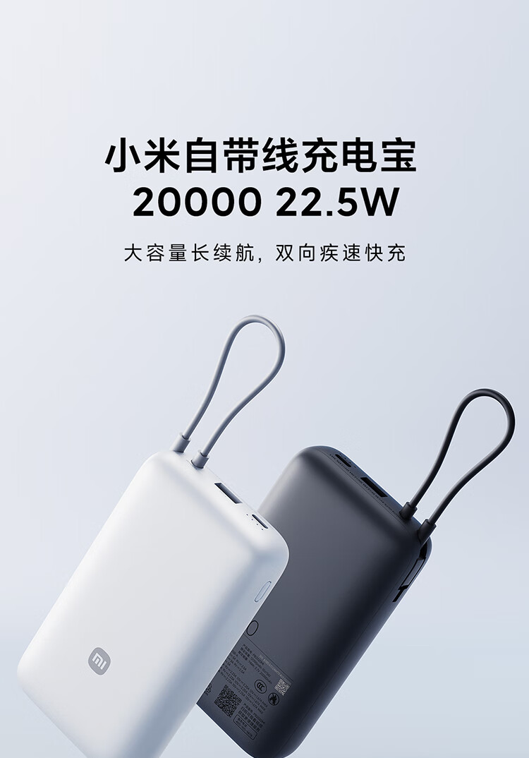 小米(MI)【3C认证】小米自带线充电宝 20000 22.5W 浅灰 可上飞机/火车多彩便携 iPhone安卓可用